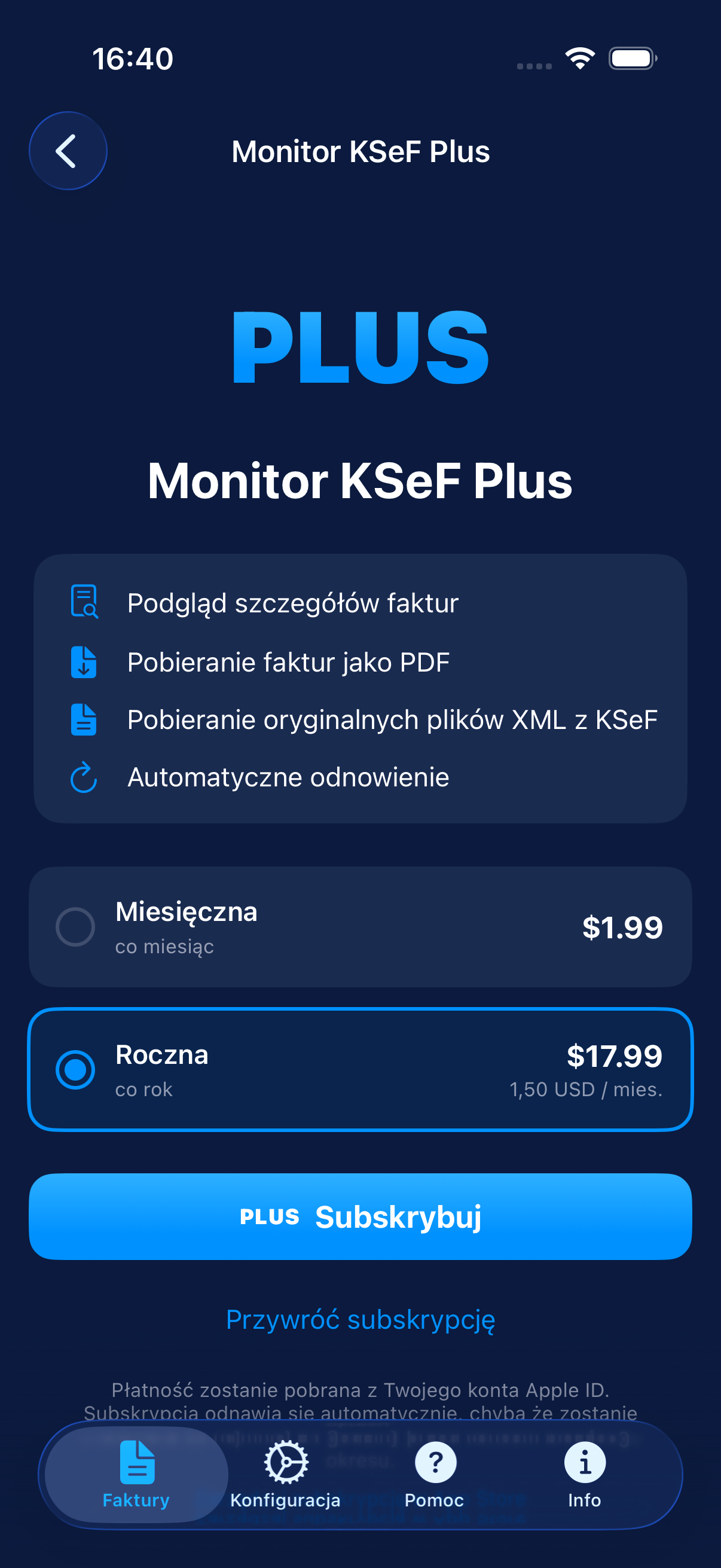 Plus to opcjonalna subskrypcja odnawialna przez Apple, która odblokuje: szczegółowy podgląd faktury (strony, pozycje, kwoty VAT), eksport do PDF z kodem QR, pobieranie oryginalnego XML FA(3). Lista faktur jest bezpłatna.